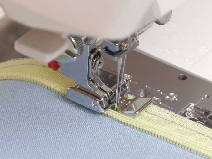 Установите лапку в зависимости от притачивания левой или правой стороны молнии.Опустите лапку в начале молнии так, чтобы строчка легла вдоль сгиба зубчиков молнии.